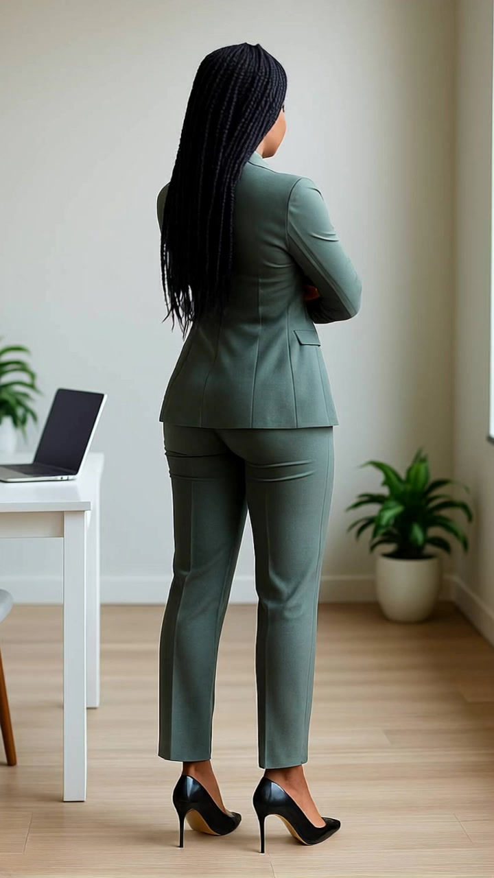 This project highlights the modern fashion choices of women in the workplace, featuring a woman in a green suit standing in a contemporary office setting. The images capture the style and elegance of professional attire in a modern office environment.
